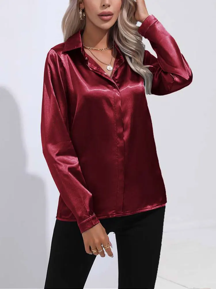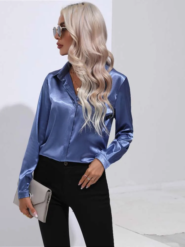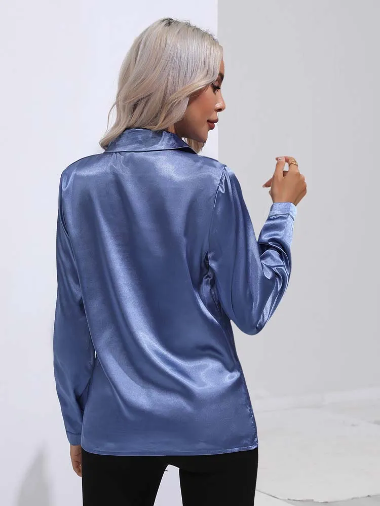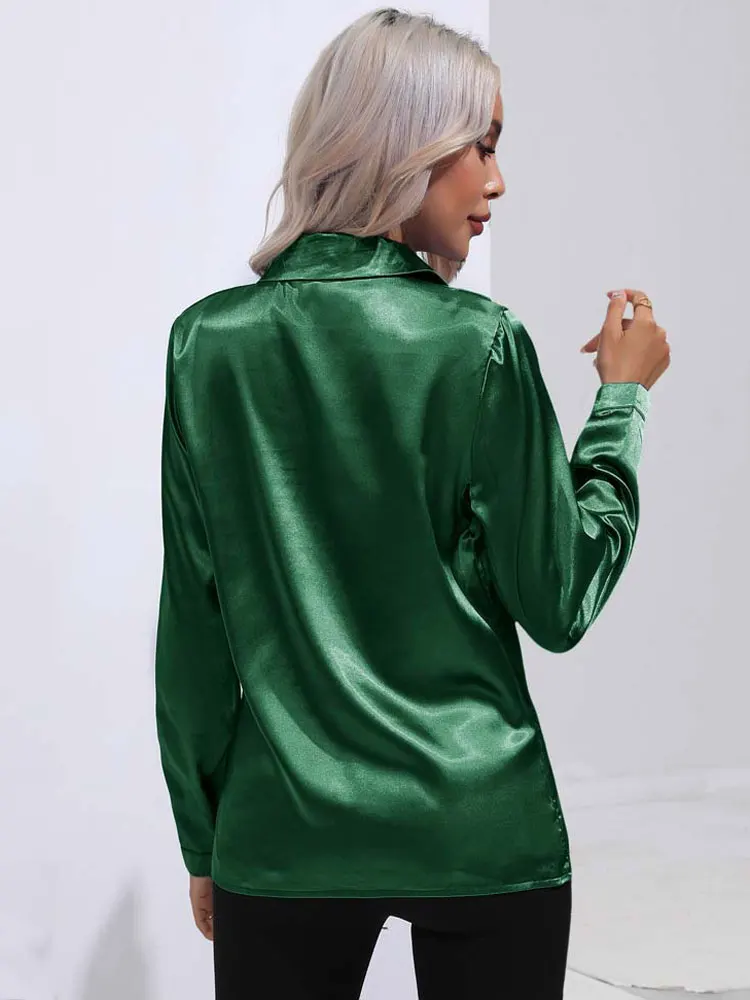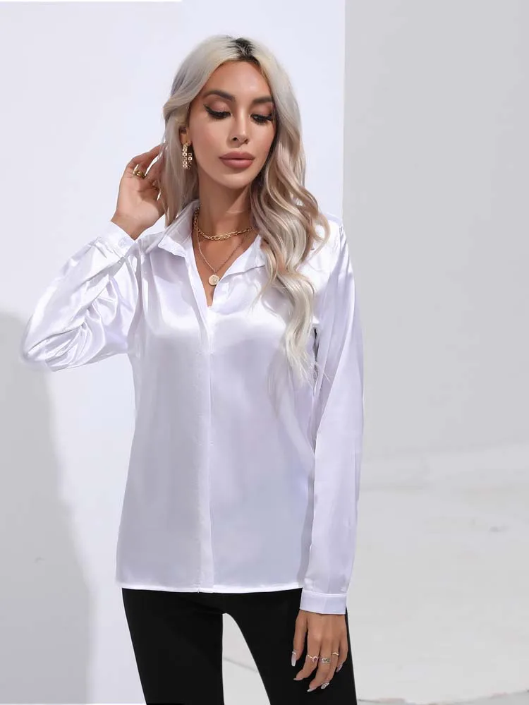 2025 Spring Summer Satin Shirt for Women, V-Neck Long Sleeve Silk Blouse Loose Office Shirt in Black White