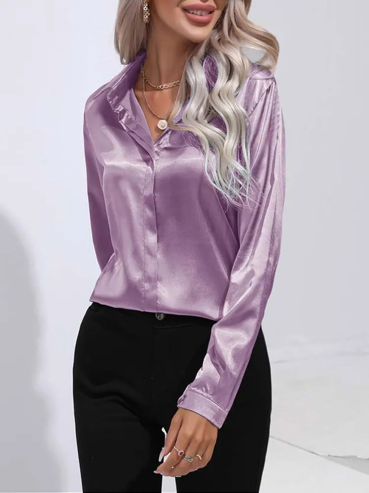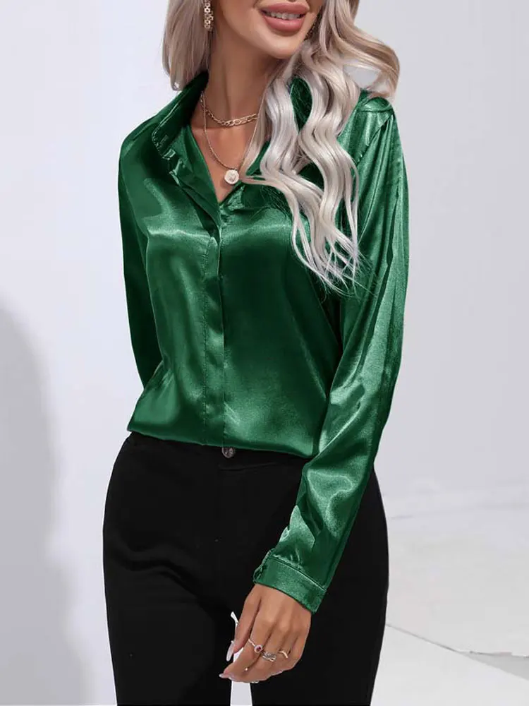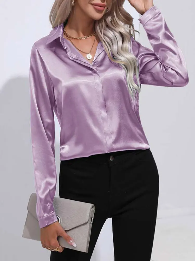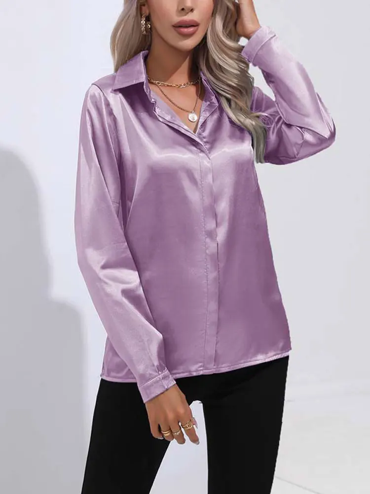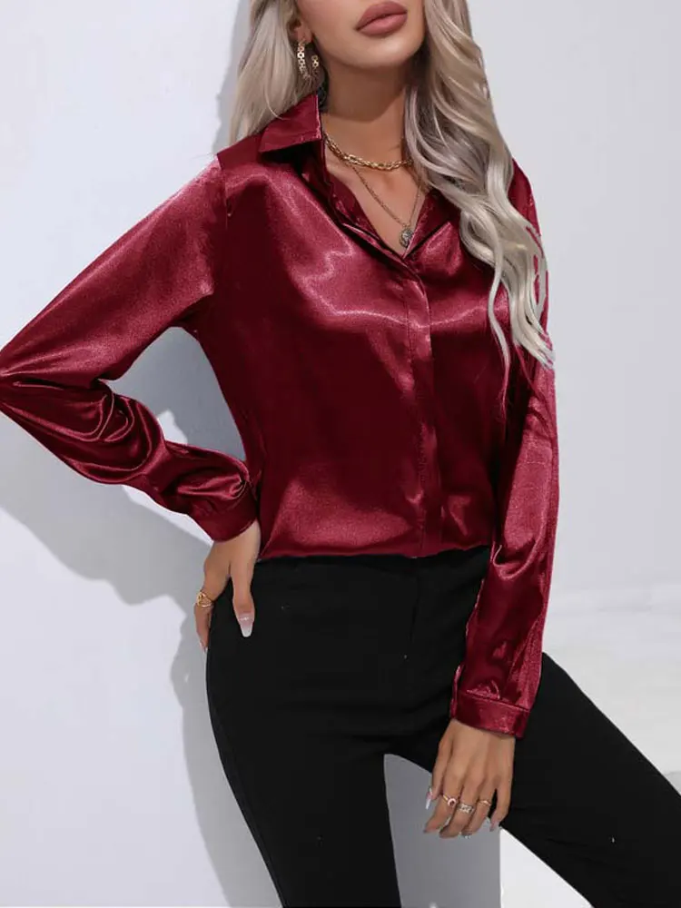 2025 Spring Summer Satin Shirt for Women, V-Neck Long Sleeve Silk Blouse Loose Office Shirt in Black White